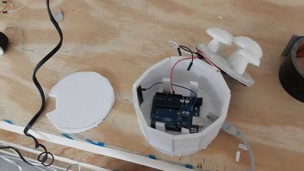 3) Coloque el Arduino en el fondo, enchufe el cable USB, reunir los cables en la parte delantera como se muestra en las imágenes y coloca el segundo círculo que se corta encima de los soportes de apoyo. Luego, coloque sus setas de eso. Como se mencionó anteriormente, el sensor de contacto es grabado donde pasan los cables así como ven en las fotos. Si el sensor no funciona bien, asegúrese de que el alambre no tiene contacto con la cinta de papel.