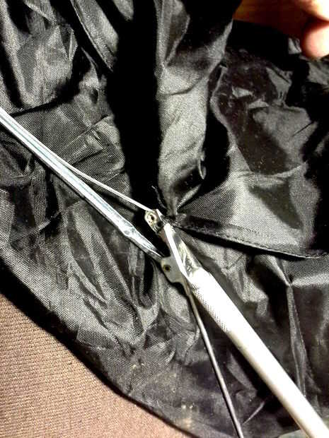 Este es un proceso bastante sencillo. Más sombrillas se cosen rápido al hardware. Utilice un cuchillo de punta para cortar la costura que une el material a la estructura. Es muy probable que se desenrosque la parte superior de la sombrilla.