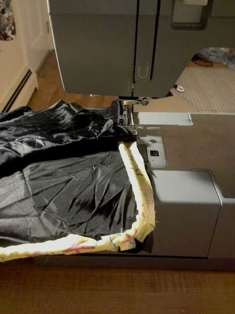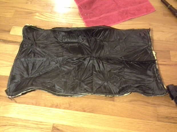 Estoy seguro de si funcionaría para colocar la toalla ahora. Queria saber podía estirar hacia fuera y edredón al frente y trasero capas de nylon por lo que decidí agregarlo último. Mi pensamiento es que pueden trabajar algunos de los pliegues de la nylon si puedo estirar hacia fuera como yo estoy cosiendo. Si cosí a una capa primero luego puedo tengo doble cosa líneas en un lado de la alfombra cuando coloque la segunda capa. Si está utilizando una cortina de ducha o algo que no es agrupado para arriba como un paraguas puede ser más fácil de agregar la toalla ahora. Simplemente colóquela encima de la pieza de nylon que está agregando.