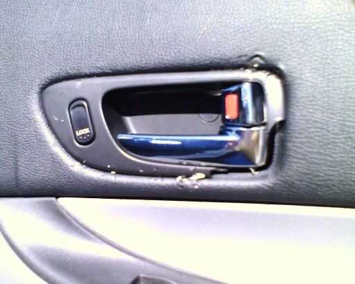 "¡ Seguro!" Pensé. "Voy averiguar cómo hacerlo". Supuse que la puerta se deslizó sobre la cosa de plástico que va alrededor de la manija de la puerta. Me equivoqué, pero tuve que romperla para resolver esto.