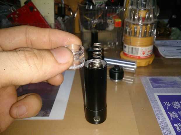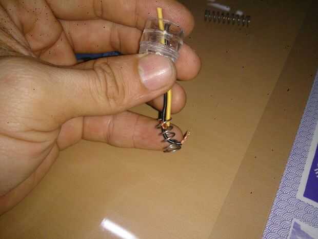 Foto 2: Conecte un cable (amarillo) en la primavera. Puede abandonar el color del cable. Utilizar diferentes colores para mejor explicación en este iBle. Está conectando batería (+) el cuerpo del metal del laser (láser diodo), dividida por un interruptor.