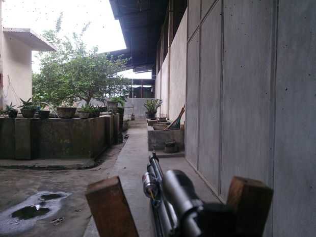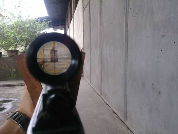 Me apunte en los ladrillos de 15 metros de distancia, vemos ahora el punto del láser está alineado en el centro de mi alcance. En mis pruebas, el punto láser puede golpear en el blanco a 12 metros a 18 metros. Menos que eso, debo como objetivo ligeramente más baja izquierda del blanco. Más de 18 metros, debo apuntar ligeramente superior derecha del blanco.