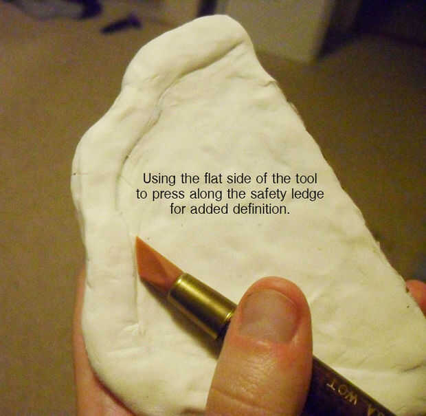 Utilicé la punta redonda para definir las crestas en la parte inferior y la punta plana para hacer el labio de seguridad más. El borde biselado de la boquilla plana era ideal para dibujar bordes en el labio.