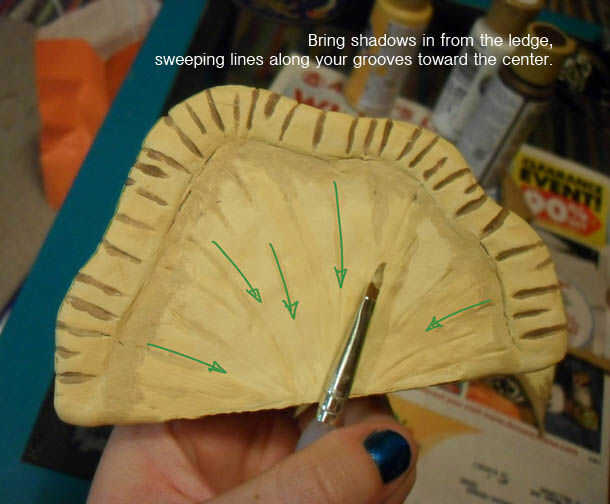 Utilizar un pincel con una punta fina para aplicar sombra color. Acentuar las ranuras a lo largo del borde, el borde de la cornisa de la seguridad y las líneas de la plataforma y el tallo. No se preocupe de ser muy preciso. Color moteado y el ancho de la variada línea contribuirá al aspecto orgánico de la pieza.