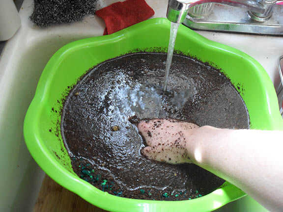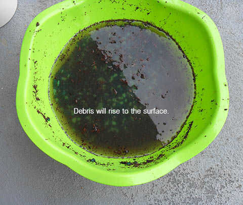 Para hacer esto, usted simplemente llene el recipiente con agua y mezclar con la mano. Los desechos fibrosos, más ligero flotará en la parte superior mientras la grava en el fondo.