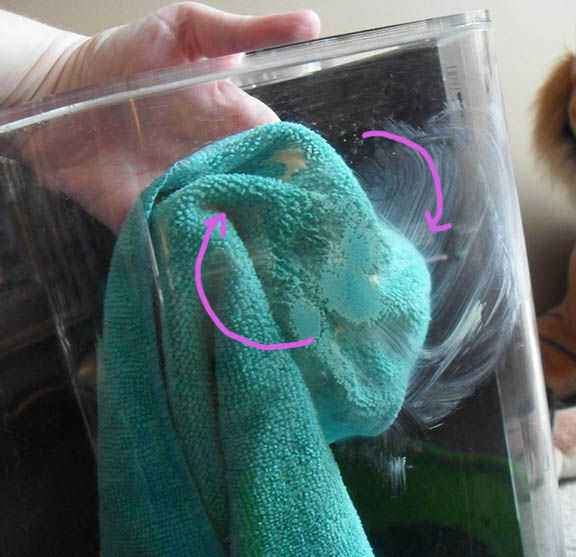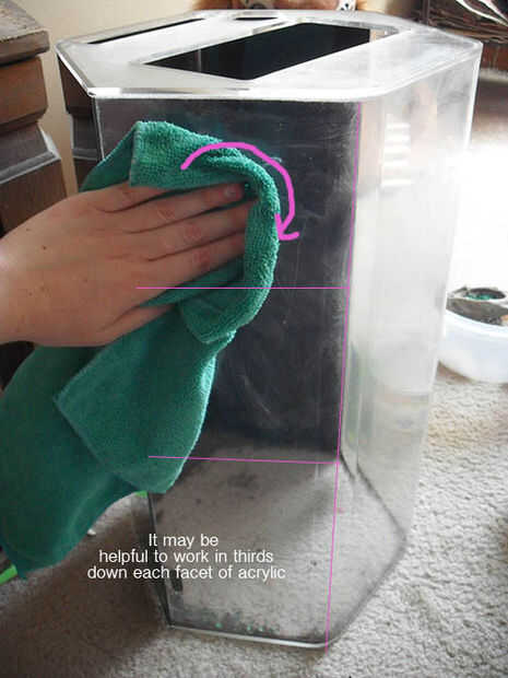 Movimiento de aplicar el acrílico y el frotar de forma circular. Aplique una presión firme. Recuerde, está tratando de fregar la superficie hasta una incluso nivel. Esto tomará un poco de tiempo y codo grasa. Dependiendo de su tamaño del tanque, puede aprovechar pidiendo a un amigo para mantener el tanque mientras friega, para que pueda centrarse en su presión.