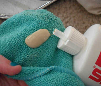 Squirt cucharada tamaño de un cuarto sobre una toallita de microfibra (Utilicé el tipo que se puede utilizar para pulir el auto).
