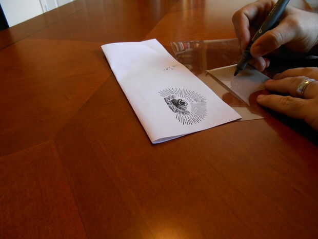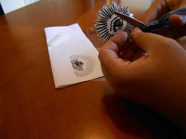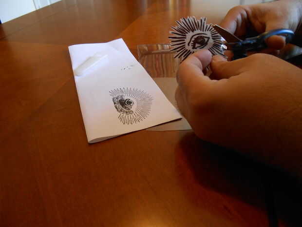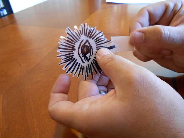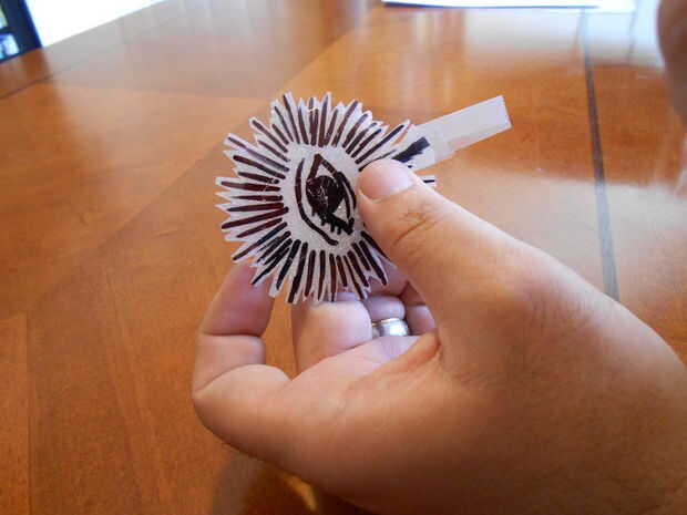 Usando el marcador negro, dibujar los ojos en el plástico colocando el plástico sobre la imagen del ojo impresa y lo rastreo. Mantener el ojo en el centro. Lo elegí a mano alzada porque quería hacerlo más grande y cambiar la forma de la misma. Después de haber hecho el ojo, dibujar líneas hacia el exterior del ojo haciendo que los rayos. (Si no son artísticamente inclinado, también puede imprimir una imagen del ojo de ver todo en una hoja de transparencia en la impresora)