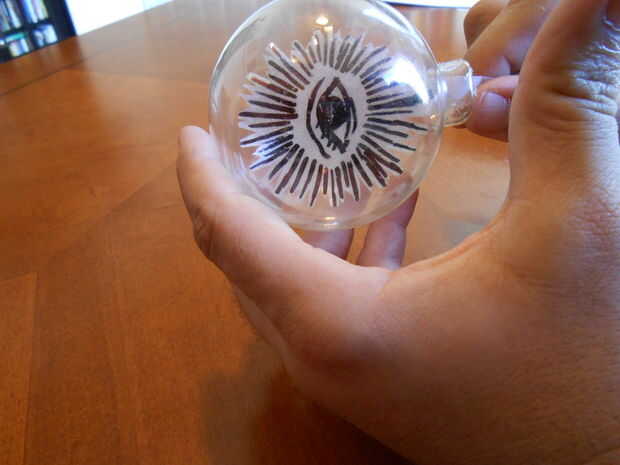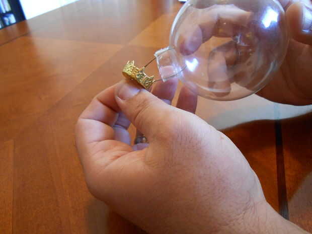 Tome la cubierta de la bola de cristal ornamento. Roll "el ojo de ver todos" en forma de pequeño tubo e inserte en el ornamento, con la lengüeta hacia fuera el adorno. Ponga a un lado.
