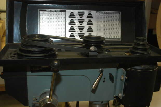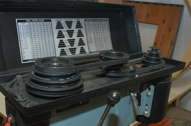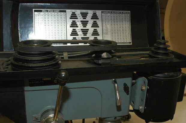 Comprobar a qué velocidad del taladro se encuentra mirando la posición de las correas y comparando sus posiciones de la tabla en la tapa. (Esta primera foto muestra que la velocidad se establece en 3000 rpm).