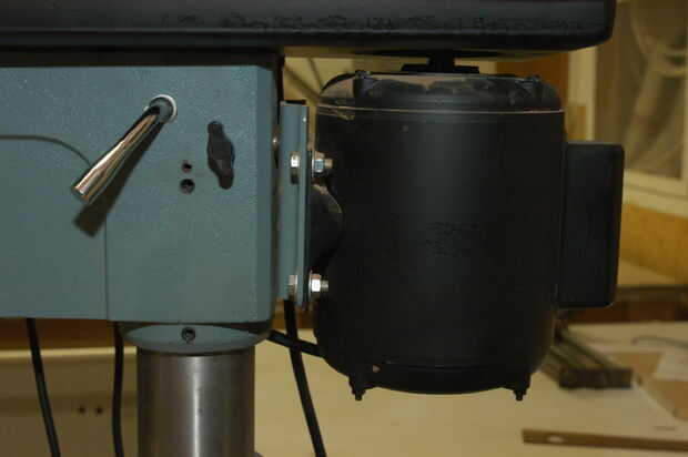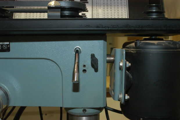 A continuación tire de la manija de cromo grande a la derecha hacia la derecha hacia la parte delantera de la máquina. Esto adelantar el montaje del motor y liberar la tensión en las correas. (Foto 3) (Tenga en cuenta que en dos de nuestras prensas de taladro esta palanca no funciona. Será necesario tirar adelante el montaje del motor: Sujete ambos lados del montaje del motor y que apoya contra la parte delantera del bastidor superior, saque el motor hacia adelante.)
