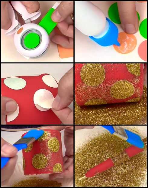 De los cirios, pintar rayas con pegamento blanco y espolvorear con purpurina