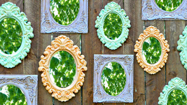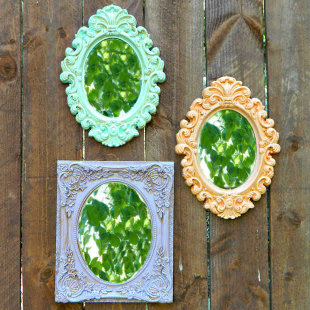 Adoptar marcos de tienda de dólar Recargado, plástico y darles una sensación antigua cara con pintura de revestimiento calcáreo y cera. Crear una pared entera de ellos por muy poco dinero y gran impacto!