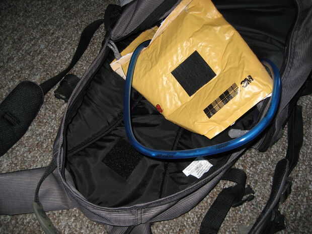 Agarrar cualquier bolso vas a ser en este montaje. He utilizado una mochila al azar que tengo. Hipotéticamente, podría utilizar cualquier bolsa caben en el sistema y todavía tiene el tubo de llegar a la boca. Obtener la envolvente acostado donde usted lo desee en la bolsa y utilizar el mismo truco de Velcro desde antes de aplicar el lado del lazo a la bolsa. Ten en cuenta que será varias libras de agua en esto, así que asegúrese de que poner el Velcro en una ubicación estable. Todavía estoy trabajando la óptima solución general a la base de la mochila. Velcro es la única opción que tuve en este bolso porque realmente no había espacio para nada más. Pero las correas y los clips de una manera mucho mejor de hacerlo, como el Velcro me pone preocupado por la carga tire y ser libre flotante si saltan de un borde de la épica o algún otro evento de la alta aceleración. El bajo posicionamiento de la pieza superior de Velcro le dio la bolsa demasiado juego, consecuentemente tenía suficiente influencia para pelar el Velcro aparte. Poner la segunda pieza más arriba parecía resolver el problema, pero un sistema de cerradura positiva (clips, anillos en D y las correas, etc.) sería mucho mejor. Adición de soporte a la parte posterior de la envolvente también ayudaría. Una versión 2.0 mi vienen hacia fuera pronto, dependiendo de cómo se prueba esta versión.