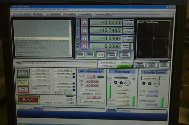 Por fin empieza la diversión. Potencia de la máquina y la computadora y abrir Mach3 o EMC. Estas son las interfaces que realmente traducen el código g en movimiento en la fresadora. EMC es la versión de Linux de código abierto, Mach3 funciona con windows. Luego cargar el código de g usando un pendrive wireless o lo mueves archivos con acogedora oficina de la tienda fría y varonil. Haga clic en el botón de Reset. Ahora puede mover el router no correr para colocar las coordenadas 3D (X, Y, Z) de la broca utilizando el teclado numérico en el teclado.