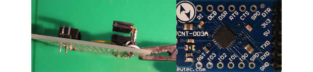 Tan visible en la imagen de arriba, la cabecera de macho de 6 pines y 6 pines zócalo hembra curvo se sueldan en una toma 'patas largas'. La cabecera de macho de 6 pines se suelda al prototipo PCB.