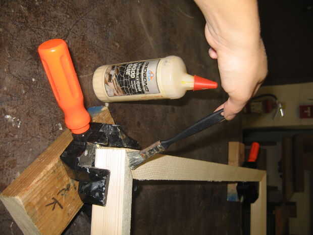 Coloque las abrazaderas sobre los bloques en cada una de las cuatro esquinas. Coloque sus camillas en las mordazas pero no los apriete. Con el pincel, aplique una capa delgada de pegamento en todos los extremos que se sujetan juntos. Apriete las cuatro abrazaderas asegurando que las esquinas queden al ras unos a otros.