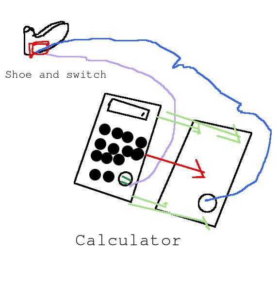 Abrir la calculadora y Conecte cada uno de los extremos del cable a los contactos superior e inferior de los "iguales" = también conocido como botón. Ponga un trozo de cinta adhesiva entre el contrato para que no conecte. Cierra la calculadora y asegúrese de que todo funciona normalmente. tienes que pulsar el interruptor para el signo = trabajar. Coloque el interruptor en la parte inferior de la zapata.