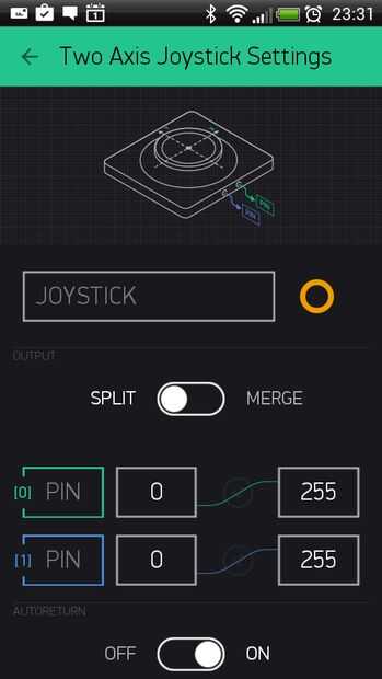 8. Añadir joystick de widget dos ejes, lo dividir en V4 0-255 y V5 70-140 (auto OFF vuelta, girar en la inclinación de)