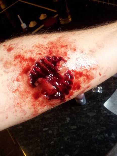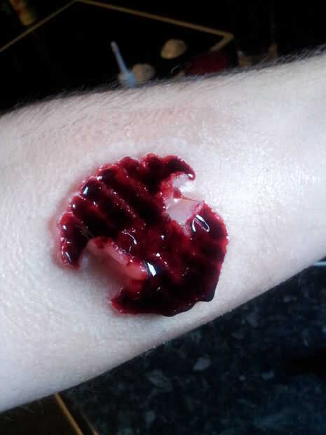 Añadir una cantidad generosa de gel de sangre en el interior de la herida y descrédito alrededor y con una esponja, toalla de papel o simplemente los dedos hasta que es bueno y sangriento.