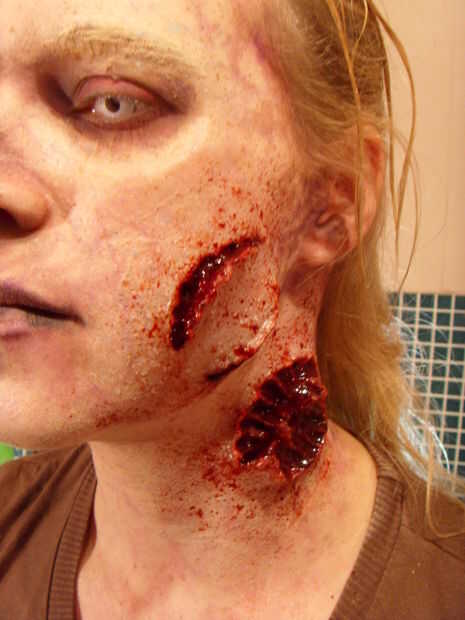 Después de colorear las mordeduras con maquillaje rojo y negro y sellar con una capa de látex hemos añadido un poco de gel de sangre y punteada que alrededor de la piel circundante.