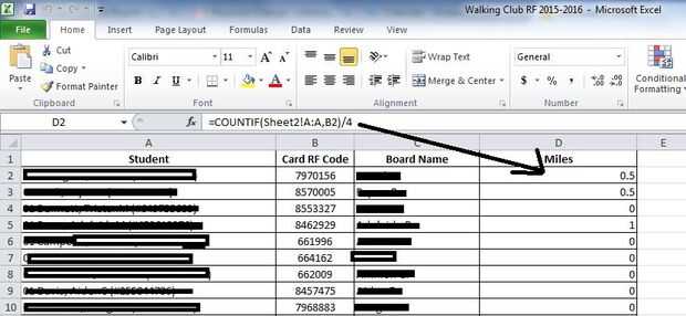Esto consultar los números en la hoja pegada y contar cuántas instancias de cada columna de números de lista en B, luego dividir por 4 para darle cuántas millas. Nuestro camino es 4 vueltas por una milla, por lo que resulta fácil calcular el kilometraje exacto.