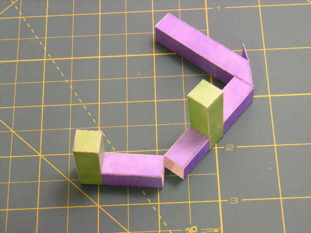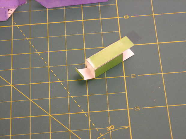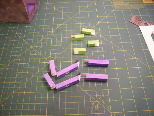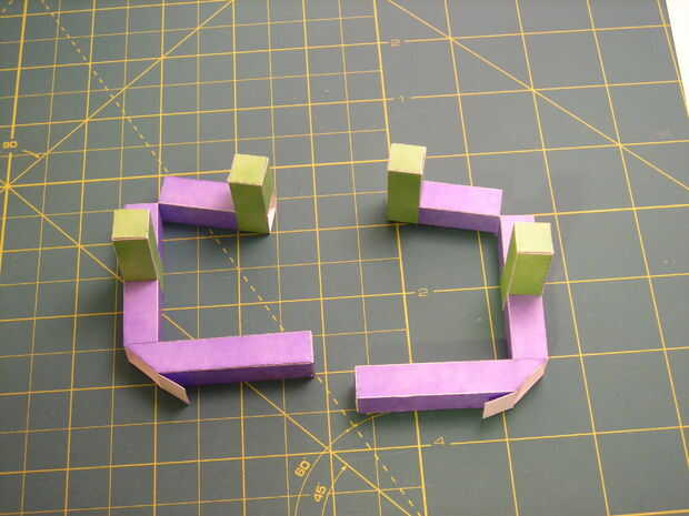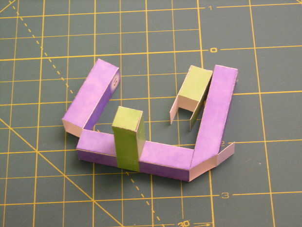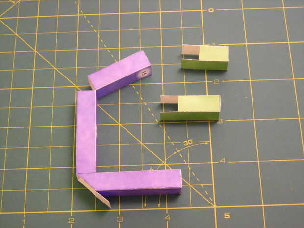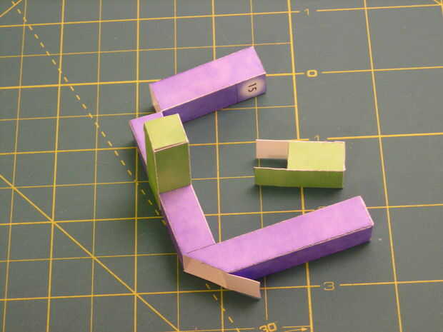 Para las partes 14, 15, 18 y 19 hay una aleta en el extremo que también necesita ser pegado abajo. Para hacer esto se aplica un pequeño poco de pegamento al lado opuesto de la Plaza (donde hay una leve whiteout en el color) y presiónela en su lugar. Para las piezas 13 y 17 pegar la aleta del extremo cerrada.