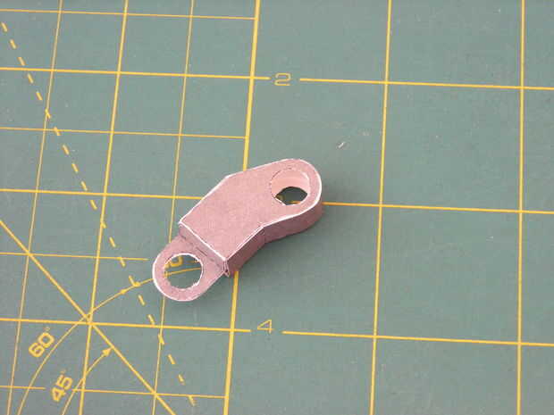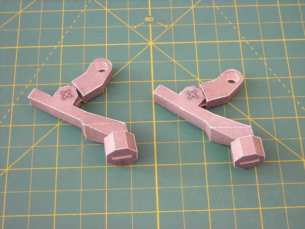 Tome uno de los prismas triangulares (como parte 33) hizo el último paso y pegarlos en el lugar como en el sexto cuadro. parte 31 está allí para ayudar a la alineación, deben ser capaces de girar libremente alrededor de la parte 33. Cuando un lado esté seco pega el otro lado en el lugar. Asegúrese de que la pierna superior está orientada para curvas para arriba desde la parte inferior, como en el cuadro 6.