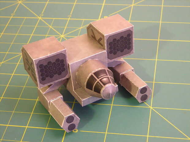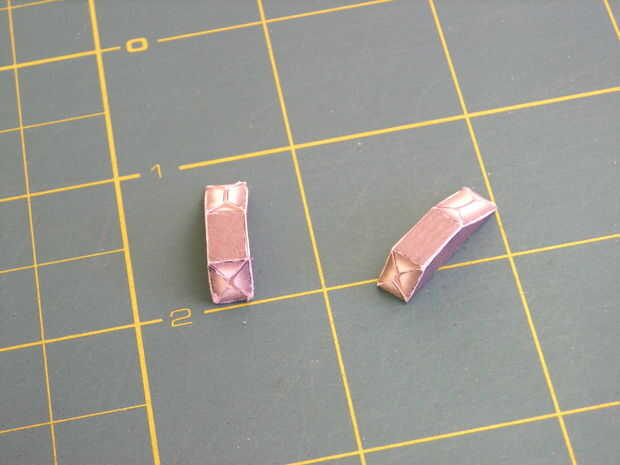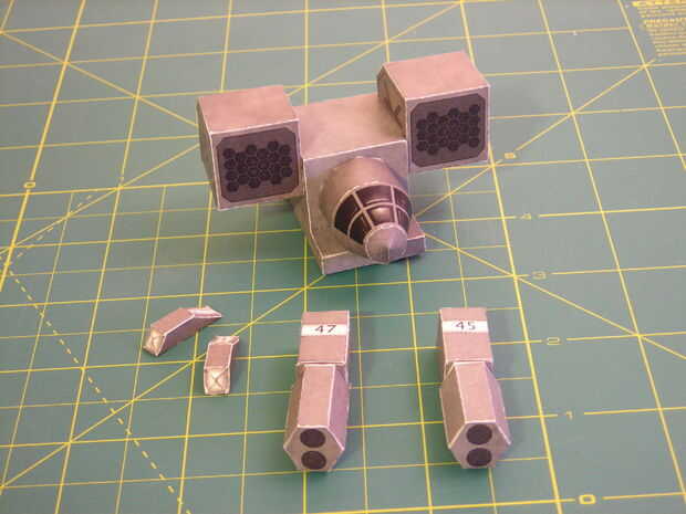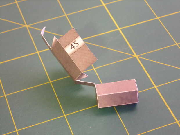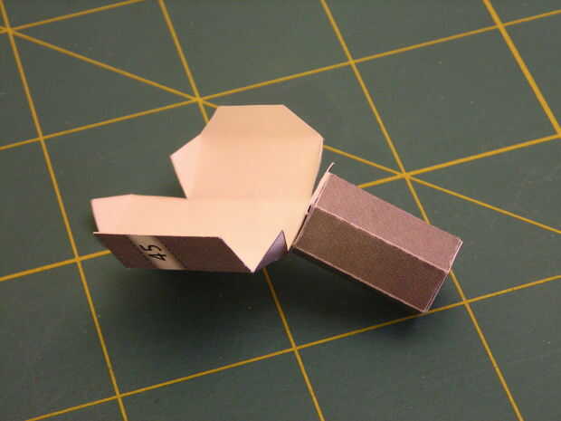 Ahora pega las partes 46 y 48 doblando el extremo con los dos círculos en la textura (cañones) en forma de prisma hexagonal. Aplique pegamento en la parte posterior de esta forma y doble la aleta conectada hacia abajo. Pegamento y doblar las partes restantes en un prisma rectangular, pegado de la solapa superior por último.