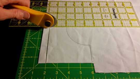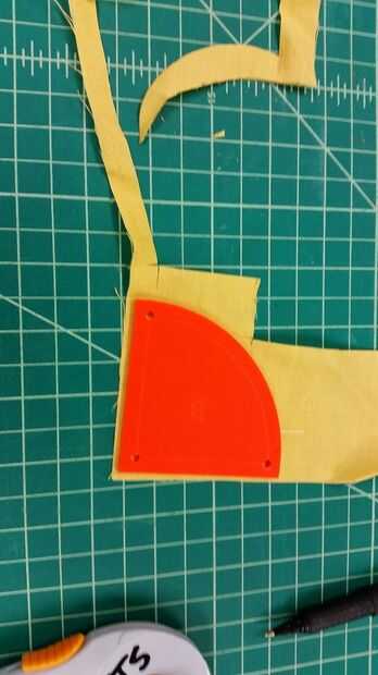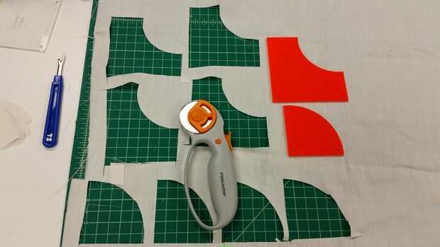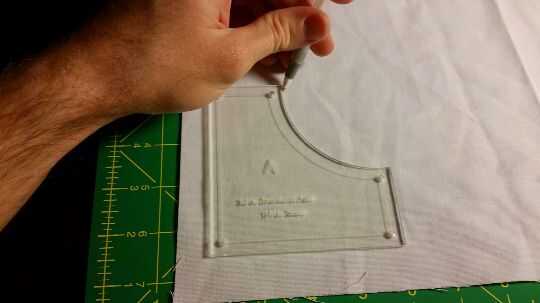 Utilice las plantillas de acrílico para cortar a la tela con su rueda giratoria (yo usé plantillas naranja en este tutorial de mayor contraste en las imágenes). Cómodamente los bordes rectos, las curvas son difíciles. Si tienes problemas para cortar las curvas con la rueda de semi-rotativa puede trazar la curva con un lápiz y cortar con la rueda giratoria o tijera afi lada. Asegúrese de marcar los agujeros para el margen de costura de 1/4" con un lápiz.