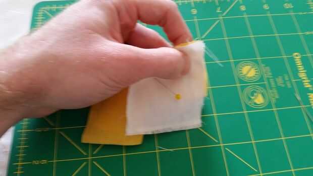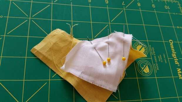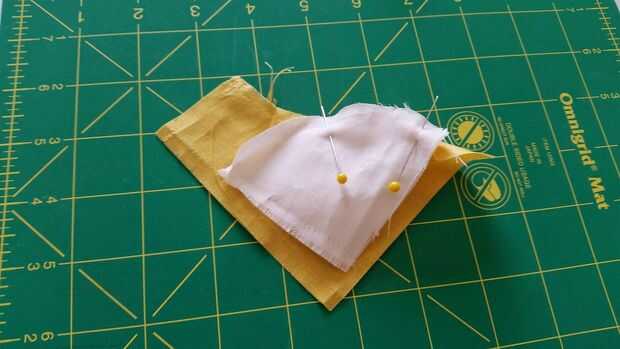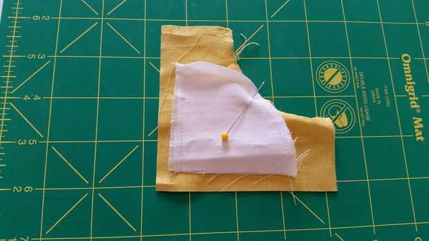 Encontrar el centro de la tela y alfileres. Ahora Alinee las esquinas y poner otro pin justo en la esquina. La tela empieza a crujir, no te preocupes si esto es normal. Ahora le ponemos un alfiler entre los dos pines que acaba de agregar. Si la tela es agrupar un poco, esto está muy bien, sólo asegúrese de que los racimos son algunos que incluso a ambos lados de la clavija de media. Ahora hacer lo mismo con la otra mitad. Debe tener 6 pines para un bloque pequeño de 3.5".