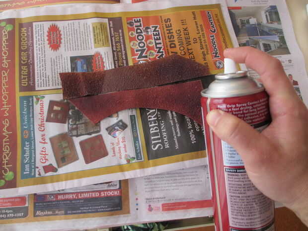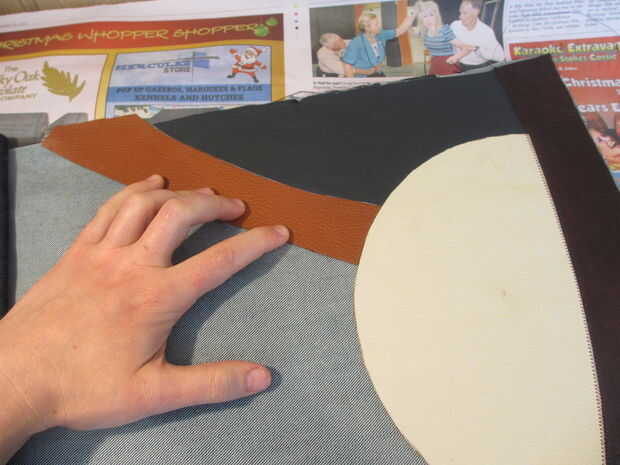 Utiliza en spray adhesivo de contacto para pegar temporalmente las piezas de cuero para el dril de algodón. Establecen algunos periódicos para absorber el exceso de spray y dejar que el pegamento seco durante un minuto o dos hasta hortera. Luego pegar el cuero en el dril de algodón donde usted quiere que sea. El vínculo es temporal, un poco como el pegamento en notas Post-it, así que si la pieza no encaja bien que quitarlo, segarla y vuelva a intentarlo.
