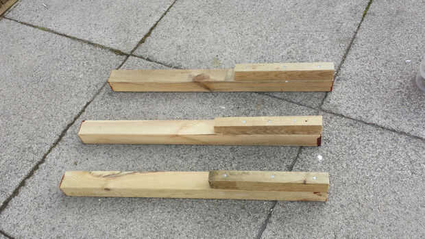 Tomar los pies 2' 2' secciones y fije el 1' 1' bloques a un extremo. Los bloques deben quedar al ras con un lado de los troncos de pie. El espacio de la izquierda es donde van a quedar las secciones de la hipotenusa de la estructura a.