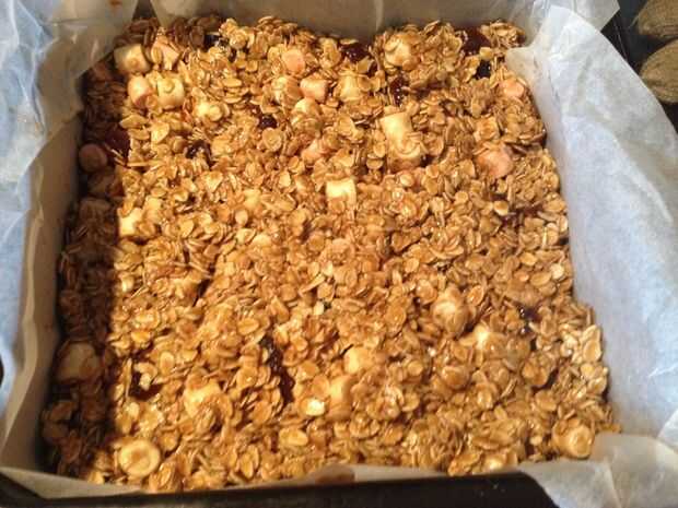Vierta la mezcla crujiente en la lata y pat hacia abajo.