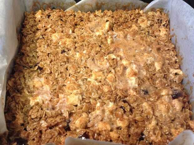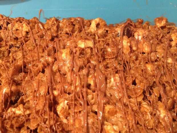 Salpicar el chocolate derretido todo el flapjack.