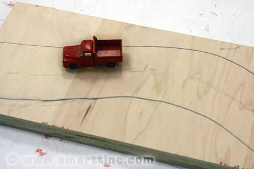 Concentrémonos en una carretera a través de un área relativamente plana. Dibujar el camino para conectar los dos puntos para conectar en la superficie de su diseño. Si su diseño es una red abierta (no superficie dura excepto en las pistas), usted necesitará colocar un sustrato plano como madera contrachapada, preferiblemente atornillarla en su lugar con cabeza plana, tornillos que se hundirán al ras de la superficie de diseño. No utilizar algo que se flexionará fácilmente. Hacer su camino tan amplia como usted necesita usar un vehículo de escala de referencia. Un carril de tráfico será alrededor del 20 por ciento más ancho que un coche. Multiplique esto por el número de carriles que quieres tu camino para tener. Una serpenteante carretera puede tener sólo uno o dos carriles. Una carretera tendría más. También puede dejar espacio en la ciudad de una calle de un carril de estacionamiento en uno o ambos lados de la calle. Añadir un poco ancho extra a tus caminos rurales para permitir un hombro de suciedad. Para este instructivo, vamos a hacer un camino de muestra.