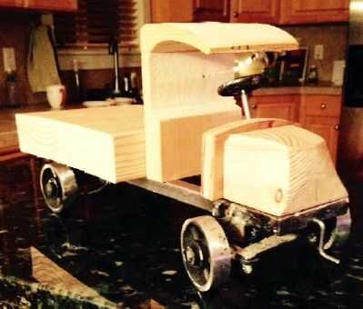 He hecho maquetas de madera de la chimenea de motor, el radiador, la cabina y la caja de descarga. Esto ayudó a juzgar las proporciones y hacer ajustes. La maqueta del motor de la chimenea fue utilizada más adelante para formar las piezas de metal de hoja para la chimenea de motor y para mantener en posición de tachuela de soldadura en el chasis de la camioneta y uno al otro.