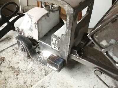 La foto muestra un camión de juguete que hice para mi nieto. Es un facsímil de un Bulldog de Mack AC descarga truck.* no es una réplica exacta a escala de 1920. Está hecha de chatarra de acero que he recogido, incluyendo la piel externa de una vieja
