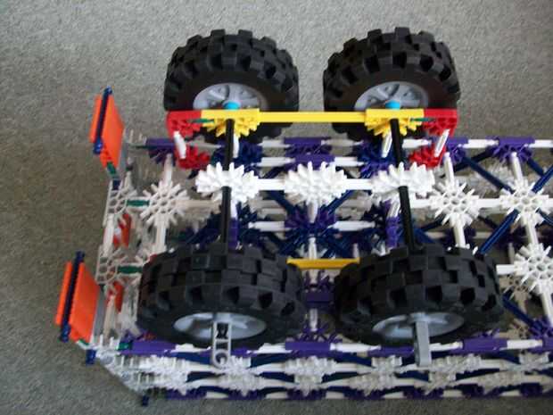 Construir el trailer. Deje un espacio libre para las piernas. Añadir la espalda, frente y piernas desde el paso 2 para el remolque. Añadir el eje de las ruedas desde el paso 1 para las barras blancas.