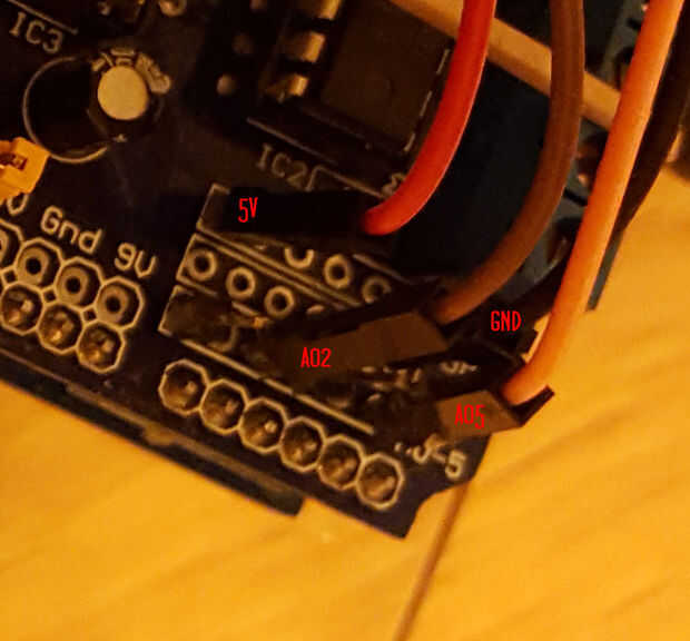 Básicamente tendremos que agregar un pin de 5v, un pin para conexión a tierra, un pin Digital 2, un pin para Analog5 y un pin para Analog2. Por defecto todos son agujeros.