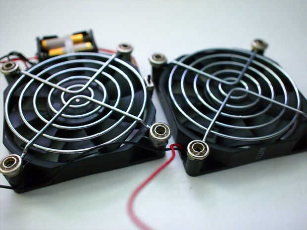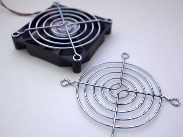 O guarda ventilador foi ligado ao ventilador e o botão encaixa em cada orifício canto guarda ventilador. Deixe epóxi para definir completamente.