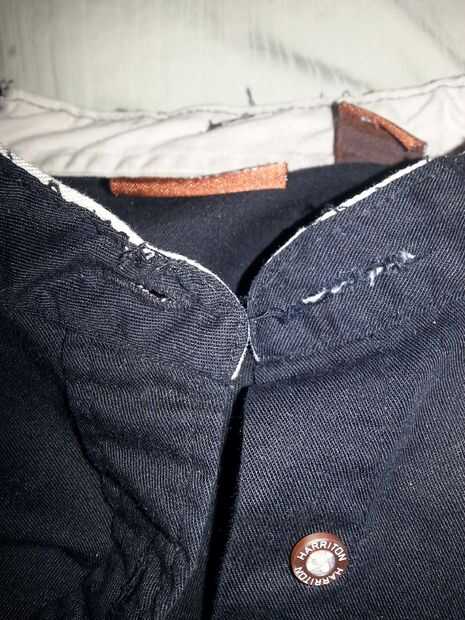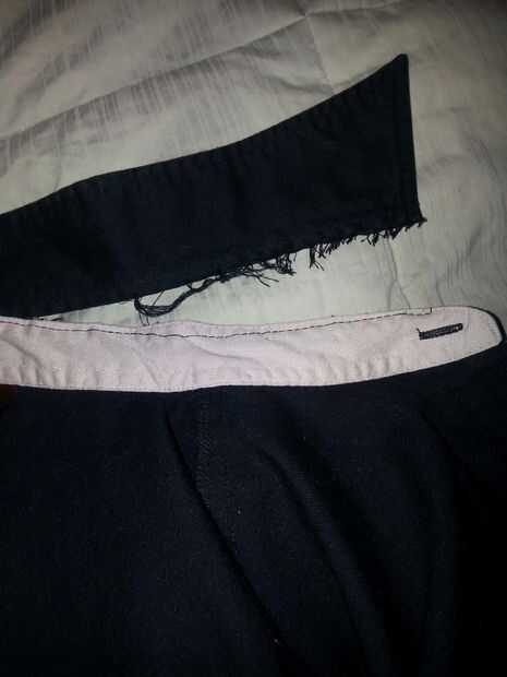 toma tus tijeras y corte la plantilla, luego recortar cuidadosamente el collar en la banda de cuello como se muestra. Deseche el corte collar.cut el botón de la banda de collar apagado y guardarlo para más adelante. cortar un ojal donde el botón estaba haciendo dos agujeros en una camiseta
