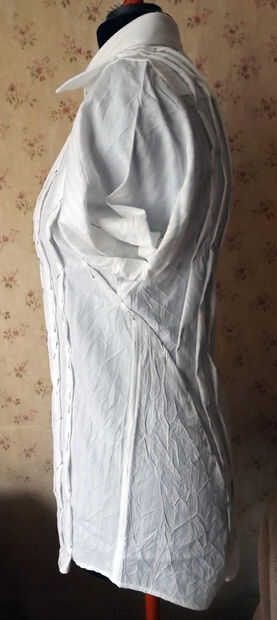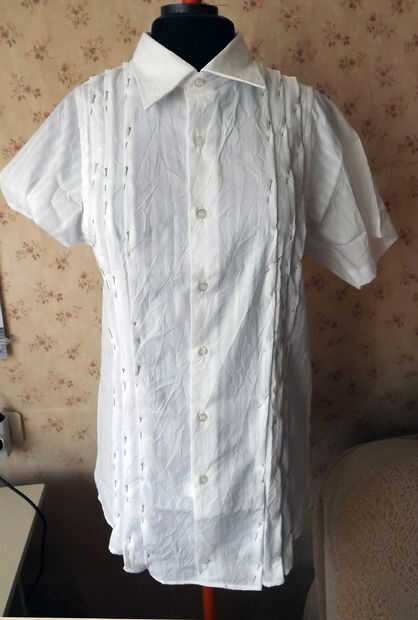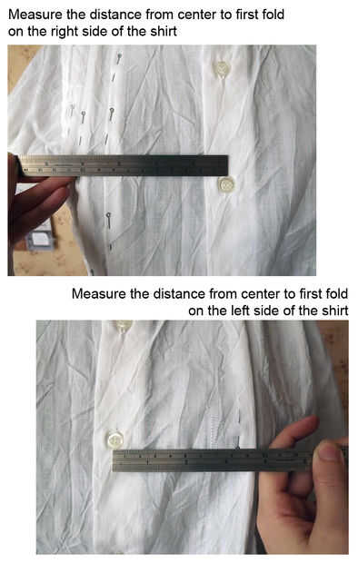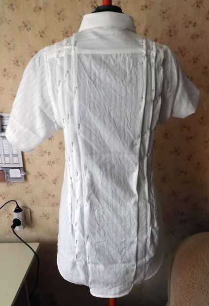 comencé a fijar los pliegues en el lado izquierdo de la camisa de los hombros así. Aquí mide - la distancia del centro a los pliegues en el lado derecho de la camisa y luego marque esta distancia en el lado izquierdo. Y todos tres pliegues en el frente y parte posterior y el dardo del busto del lado.