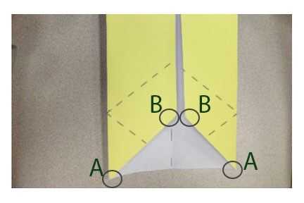 Este paso puede ser complicadas así que miran todas las fotos primero. Tomar las esquinas marcadas A y B en la imagen y pizca estos dos esquinas juntos. Esto hará que la parte inferior punteados sale el papel. Hacer un doblez por la línea punteada de abajo primero y luego pliega el papel por la línea punteada superior.