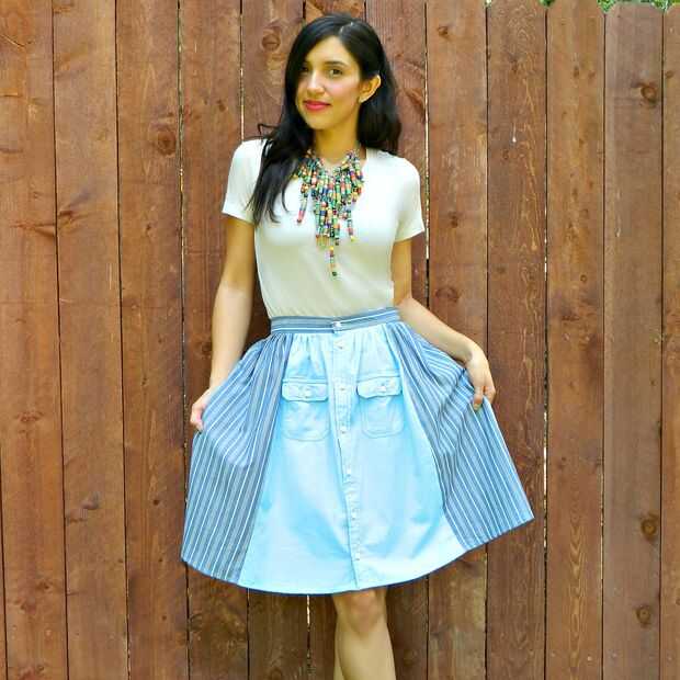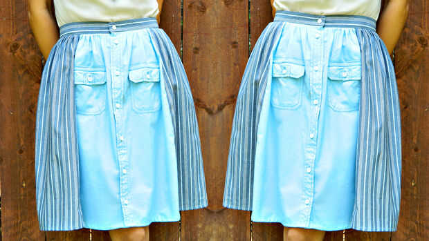 Hacer esta falda de dos thrifted camisas y agregar una pretina real cosida para un aspecto profesional.