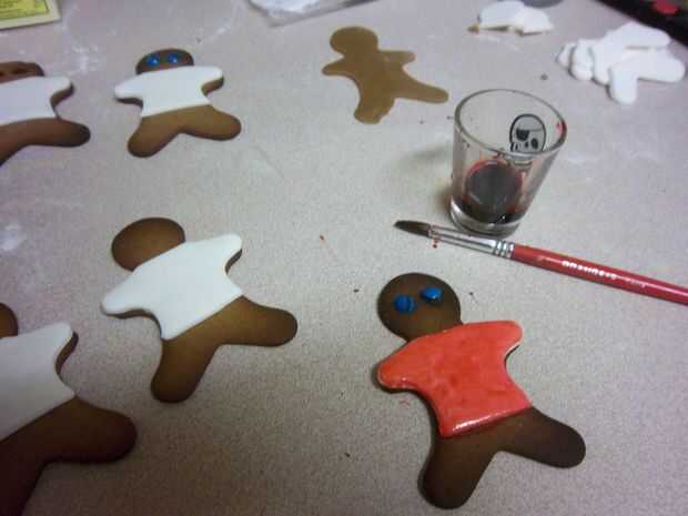 3. Coloque sobre el jengibre (puede que necesite para garantizar las camisas con algún glaseado real) y darles su real poco glaseado insignias.