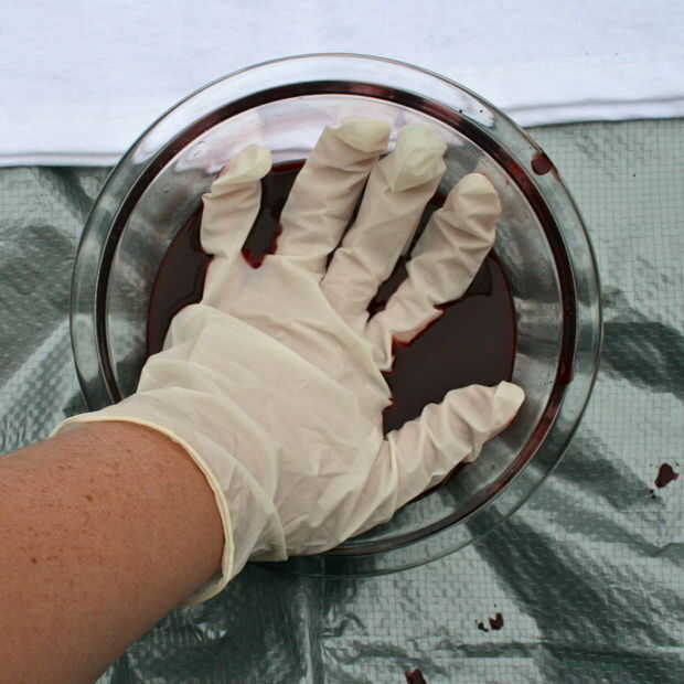 Sifón de contraste a través de la paja de la taza, la tapa con el dedo pulgar y sueltos para crear una pulverizadora larga o drible de sangre. Llenar y pop o bolsas de plástico o globos para ráfagas de sangre valientes de agua y utilizar sus manos para crear impresiones o los dedos para quitar pequeños aerosoles.