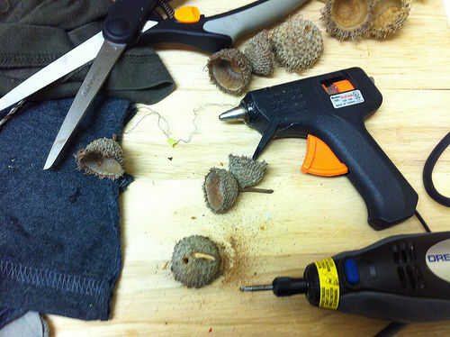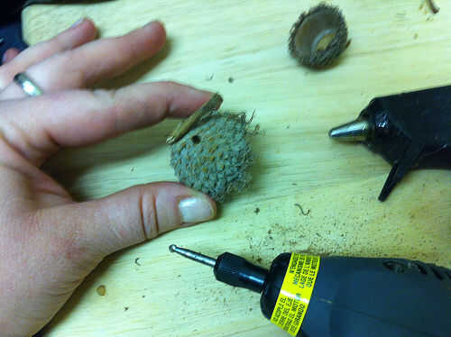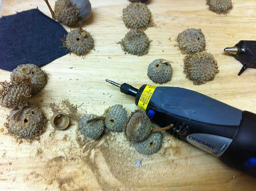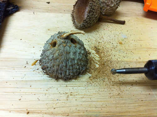 Encuentra una dremel o taladro con una broca pequeña. Mantenga el capuchón de la bellota y cuidadosamente perforar dos agujeros pequeños en la parte superior (para pasar la cadena de entrada y salida).