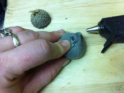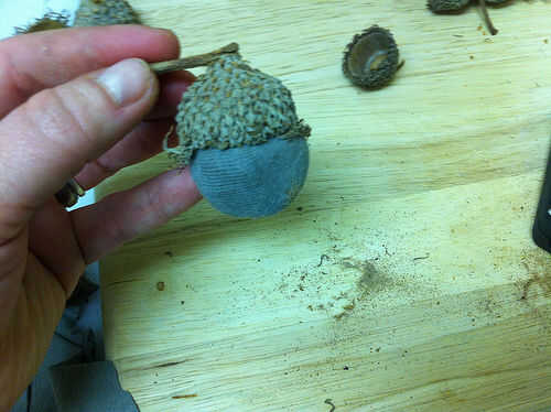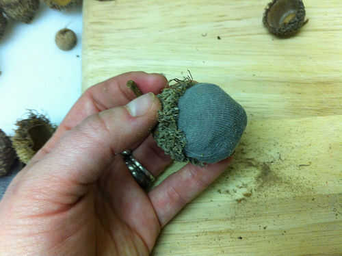 Presione la tela peluche firmemente en la tapa de la bellota, asegurándose de que todos cortan los bordes están firmemente pegados dentro y no aparece. Aplasta la bola de tela para reducir al mínimo cualquier pliegues que muestran.