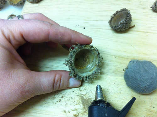 Aplique pegamento en la tapa de la bellota en el interior borde. Evite el pegamento cerca de los orificios perforados para estas cuerdas cuando termines.